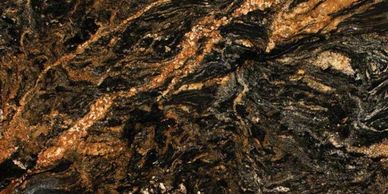 Desert Dream granite from Brazil is a dramatic statement with its black, gold, cream and gray pattern.