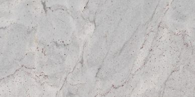 Stream White granite countertops come from India and feature tiny speckles of wine-colored dots and gorgeous gray veining across warm white backdrops